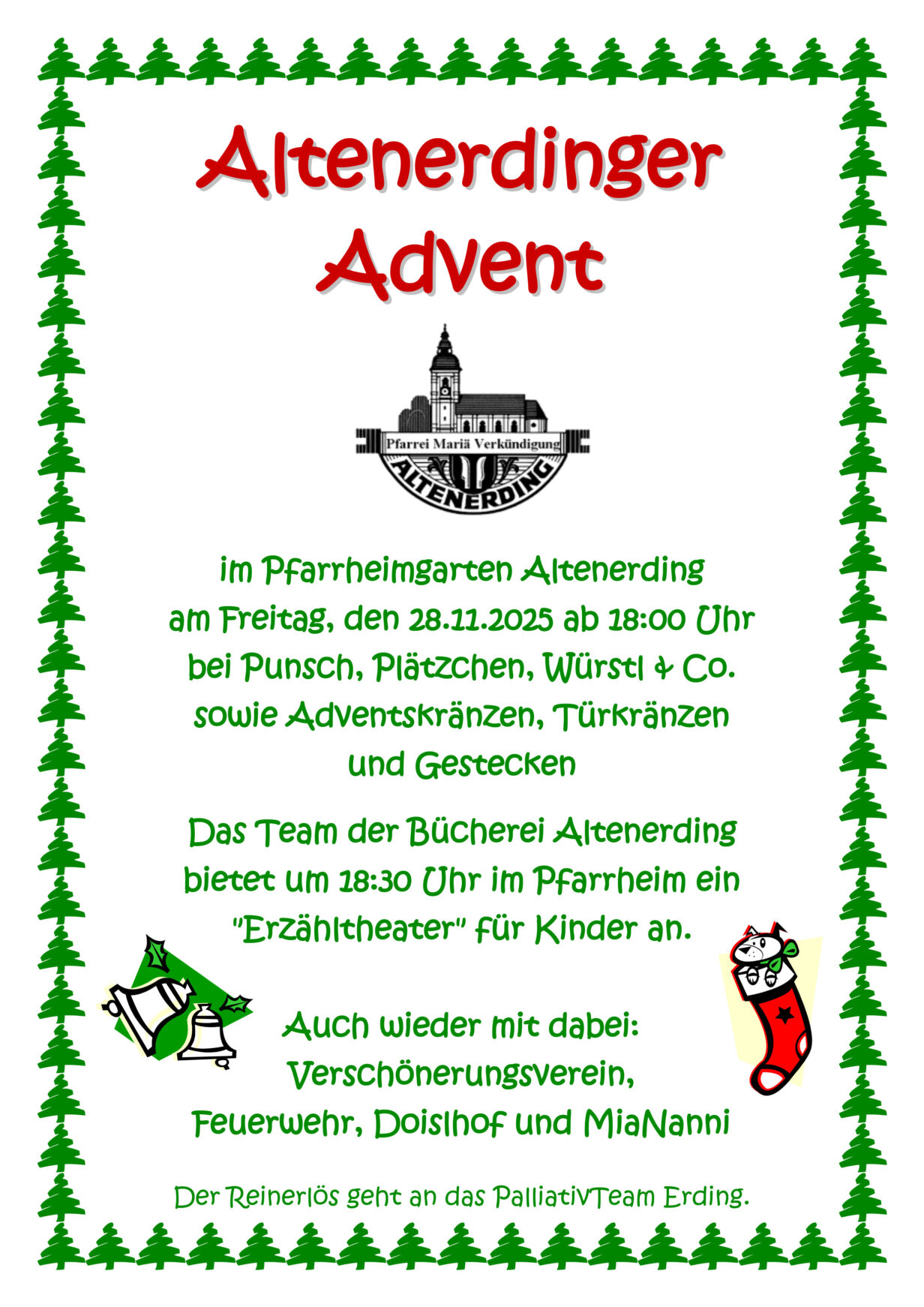 Aufgrund der aktuellen Lage mussten wir unsern Altenerdinger Advent leider absagen. Die bestellten Adventskränze werden Am Freitag zwischen 18 und 19 Uhr im Pfarrheim verkauft. Aufgrund der guten Resonanz des letzten Jahres bieten wir auch dieses Jahr wieder Adventskränze, Türkränze, Gestecke, etc. „auf Bestellung“ an. Telefonische Vorbestellung: Ab sofort bis spätestens 20.11.2021 bei Anna-Lisa Burgmair, …